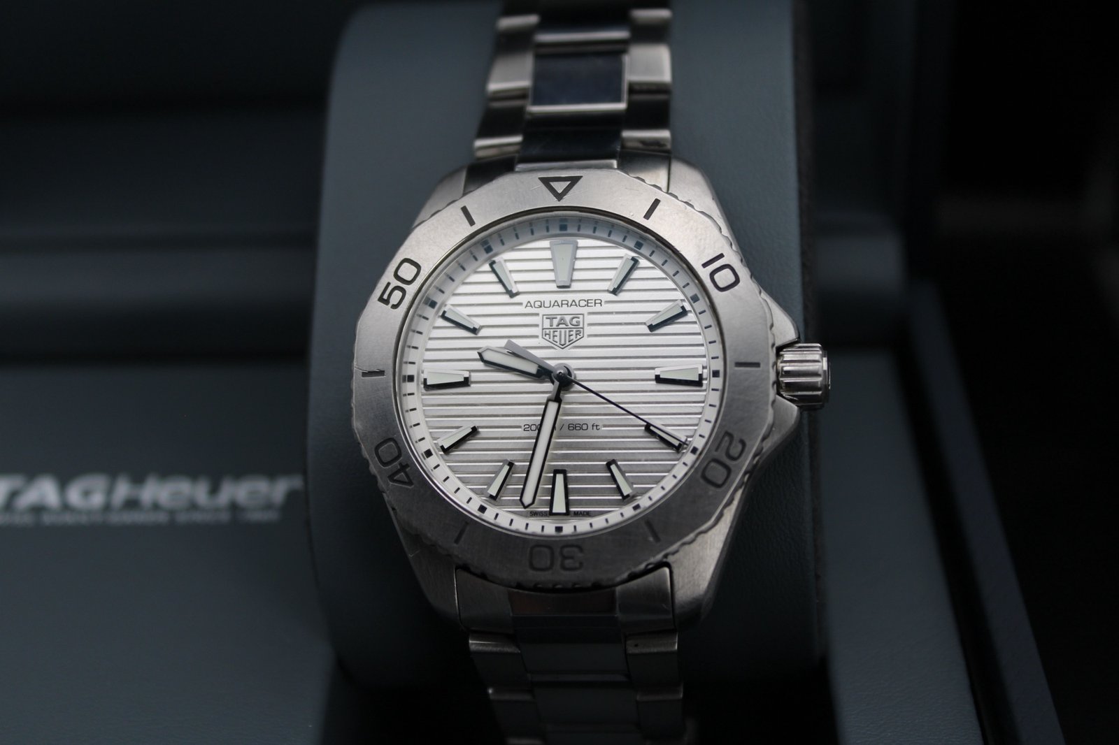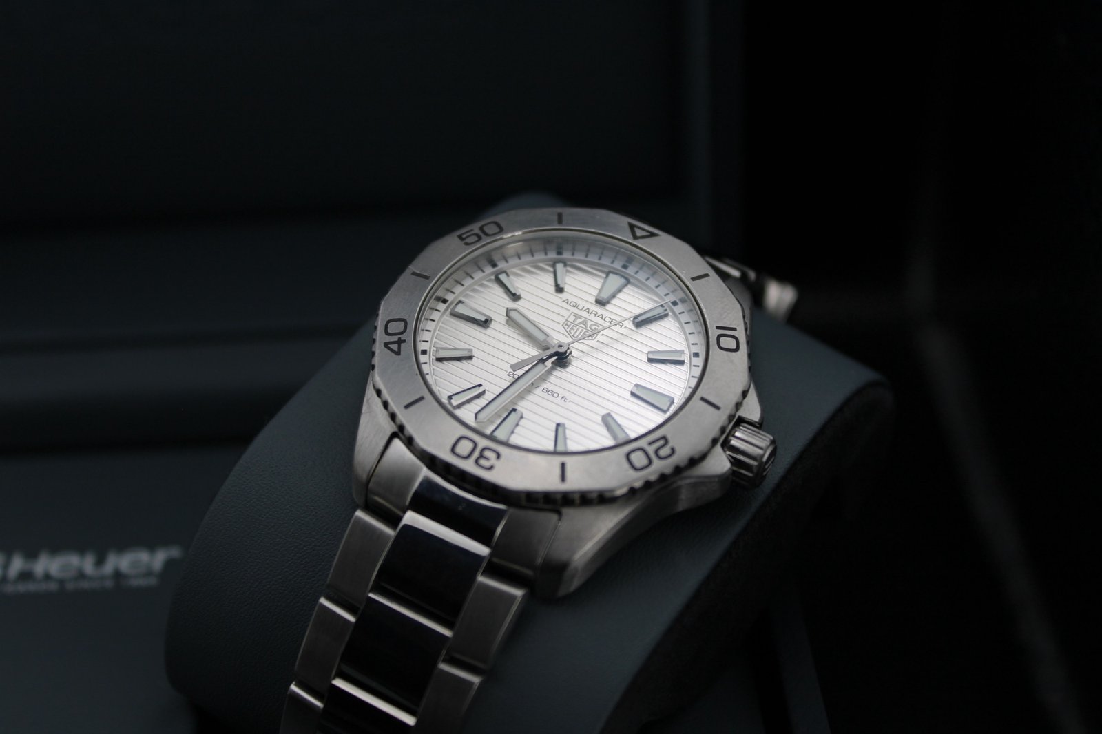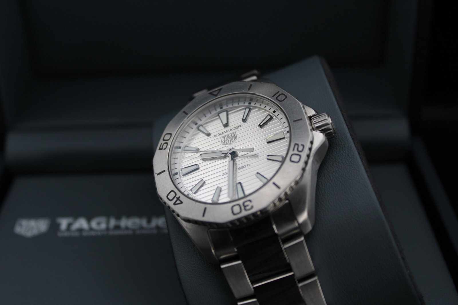 This is a very elegant and sleek model hailing from the Aquaracer Professional line by Tag Heuer. This particular model features a silver dial paired with a silver steel bezel and placed on a brushed and polish bracelet which has recently been polished so looks amazing! This is a perfect dress watch and is very comfortable and light when worn. The silver dial features vertical lines which work amazing especially when caught in the light. If you are looking for a sleek dress watch that fits comfortable and is sure to be noticed with its striking silver dial, then this is the watch for you! This 40mm men’s timepiece comes complete with its original box, papers and full links, making it a perfect addition for both collectors and everyday enthusiasts.