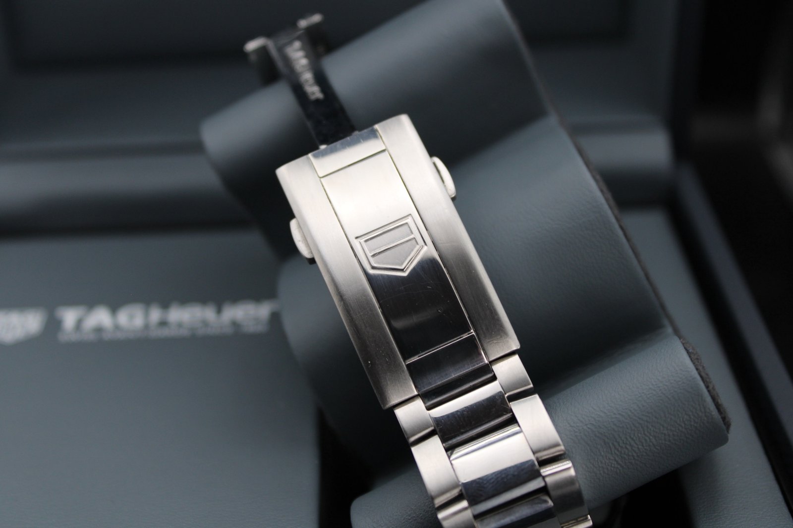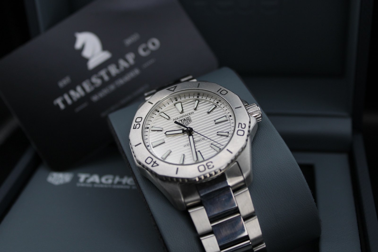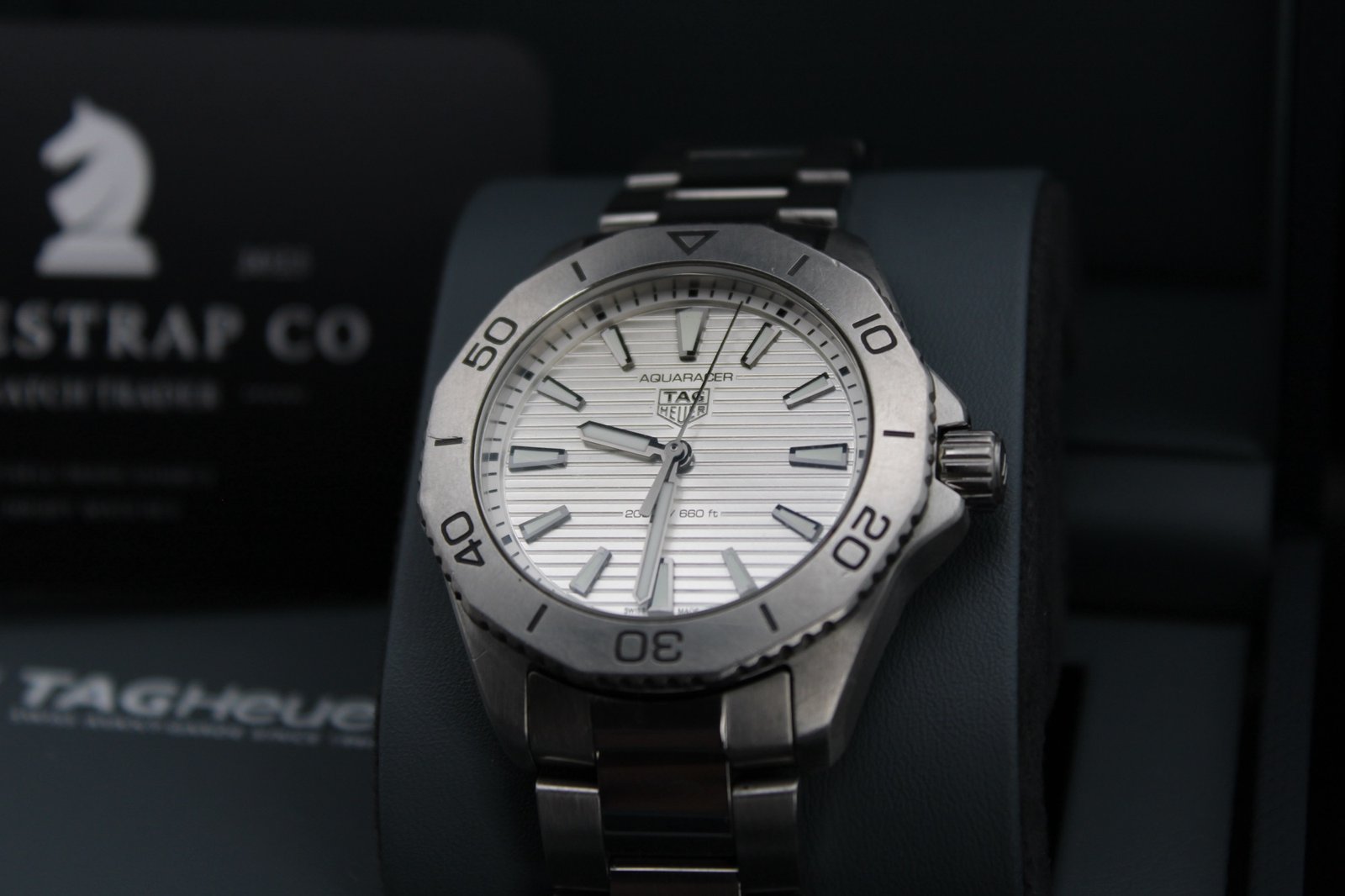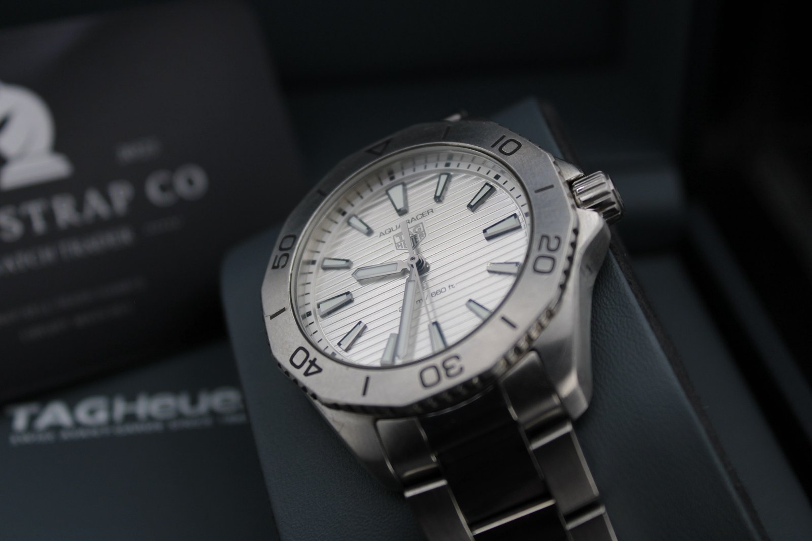 This is a very elegant and sleek model hailing from the Aquaracer Professional line by Tag Heuer. This particular model features a silver dial paired with a silver steel bezel and placed on a brushed and polish bracelet which has recently been polished so looks amazing! This is a perfect dress watch and is very comfortable and light when worn. The silver dial features vertical lines which work amazing especially when caught in the light. If you are looking for a sleek dress watch that fits comfortable and is sure to be noticed with its striking silver dial, then this is the watch for you! This 40mm men’s timepiece comes complete with its original box, papers and full links, making it a perfect addition for both collectors and everyday enthusiasts.