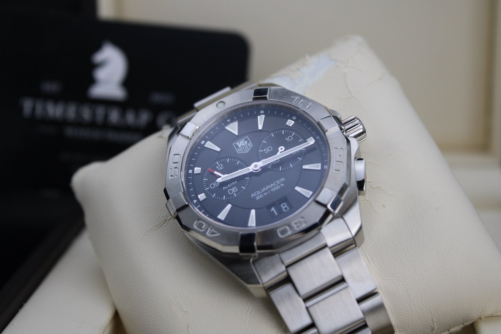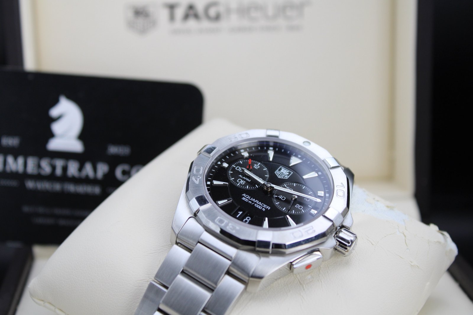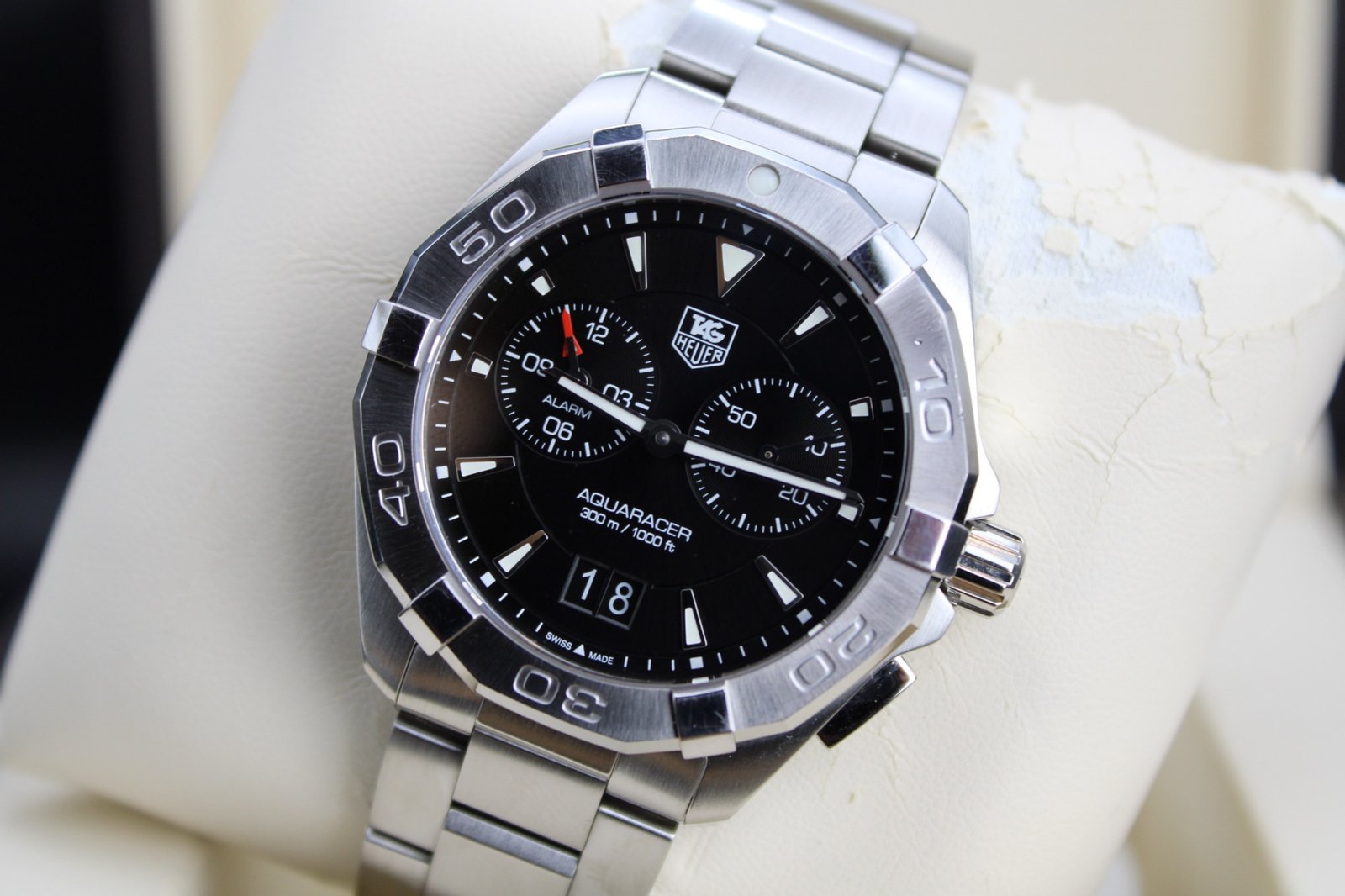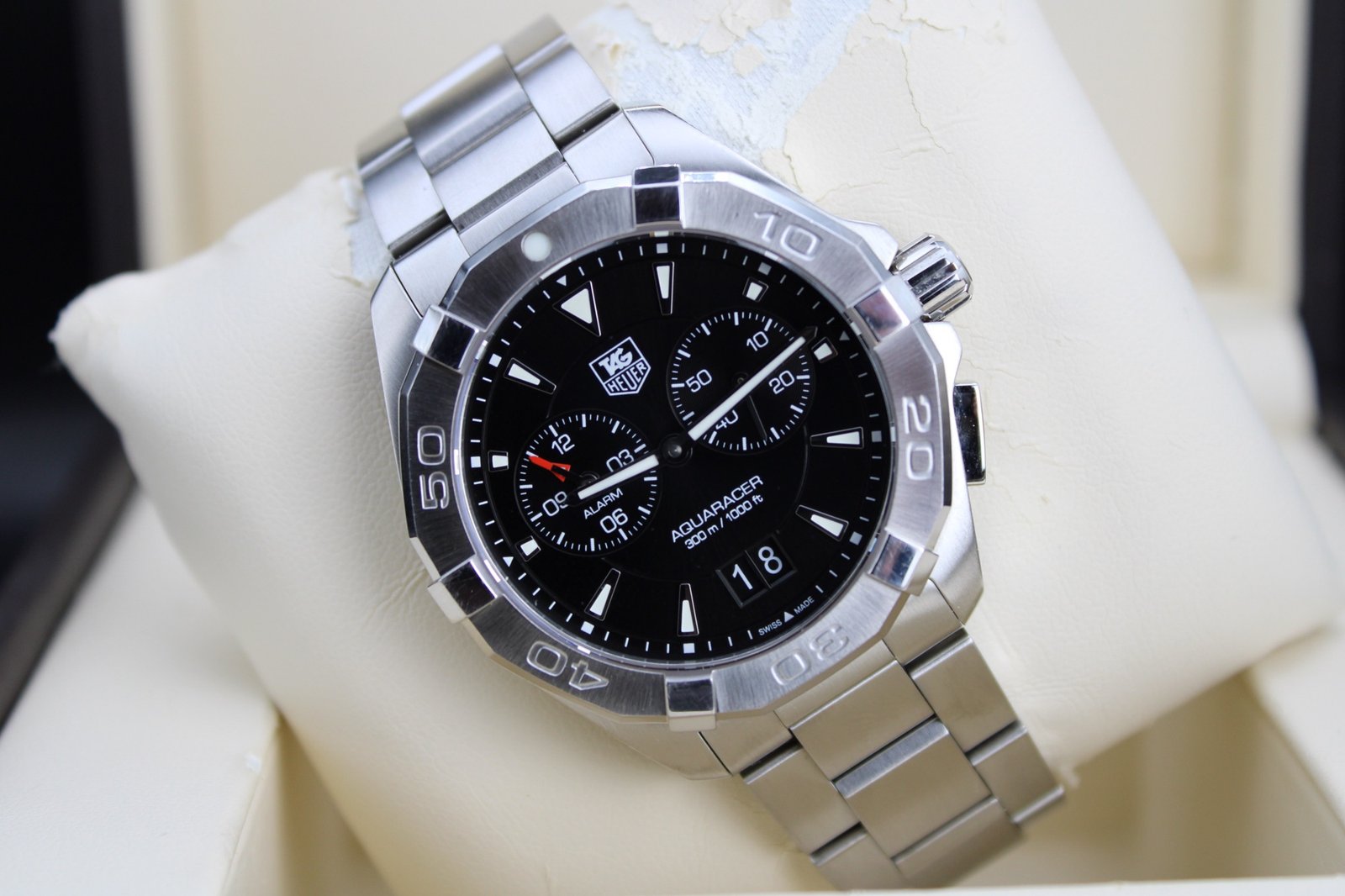 This is a very elegant and sleek watch hailing from the Aquaracer range by Tag Heuer, the watch features a black dial with a silver bezel on a stainless steel case and bracelet – it also features has an alarm function which can come in handy during sporting events or everyday activities. This watch has recently been polished so is in overall good condition with only some minor signs of wear. This is a great looking everyday watch at a very reasonable price! This 40mm men’s timepiece comes complete with its original box and papers, making it a perfect addition for both collectors and everyday enthusiasts.