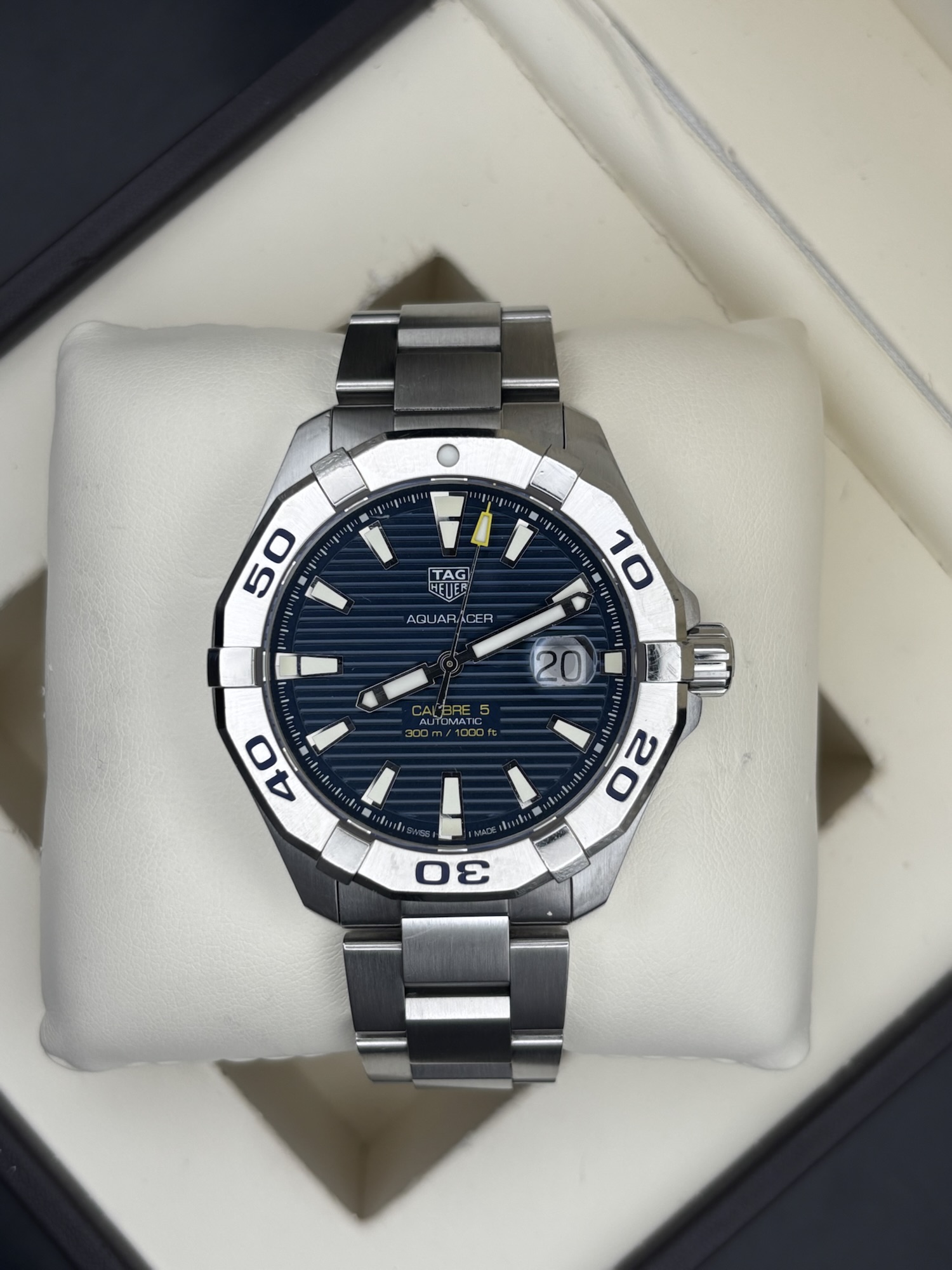 This is a stunning example from the Calibre 5 Aquaracer range by Tag Heuer. It features a deep blue dial with horizontal lines throughout the whole dial which gives it a unique design and look and works amazingly with the silver bezel featuring blue numerals. The watch is on a silver steel bracelet which is in good condition but does have some minor scratches and shows some signs of wear, as does the clasp. This 43mm men’s timepiece comes complete with its original box and papers, making it a perfect addition for both collectors and everyday enthusiasts.
