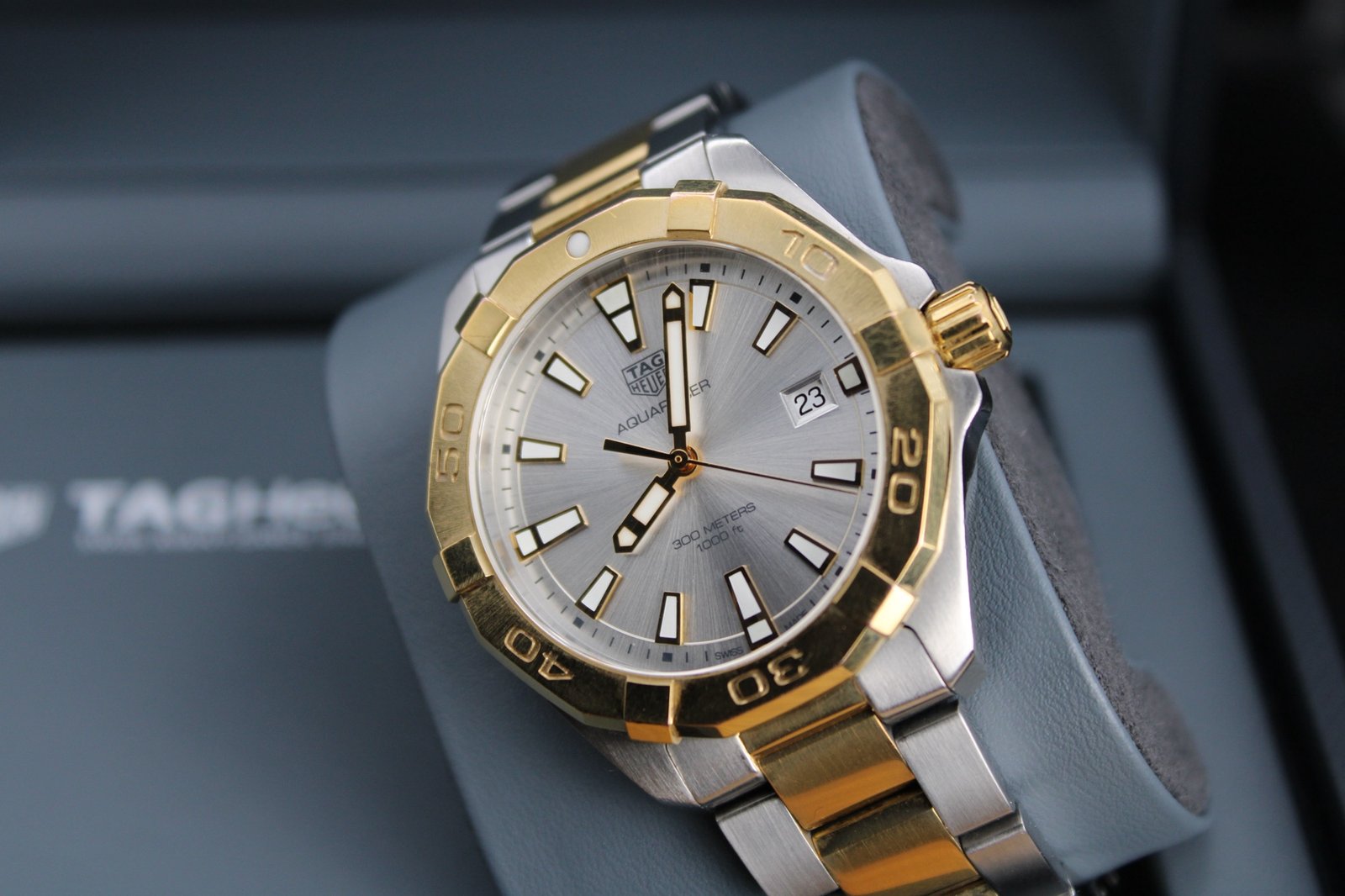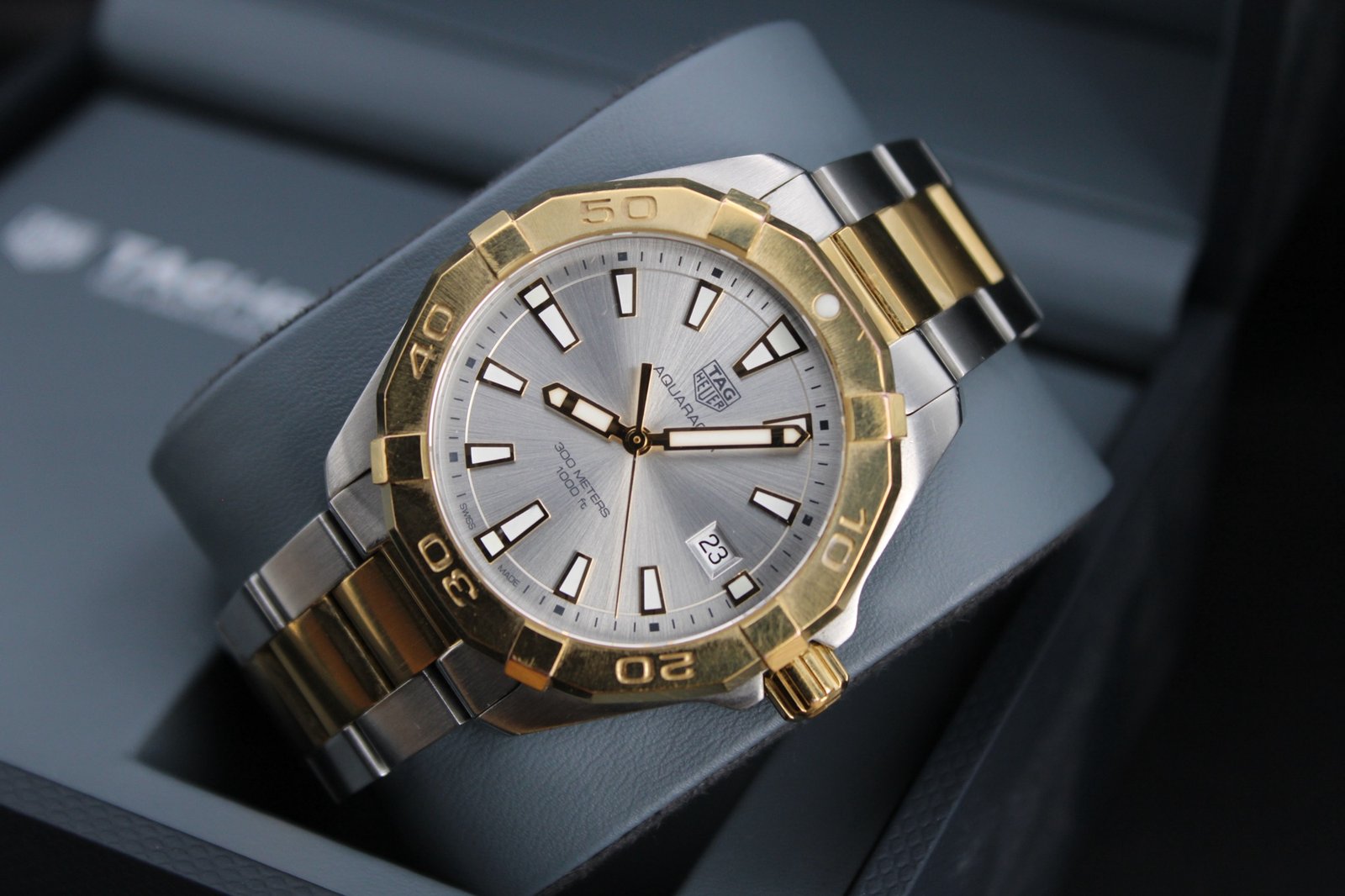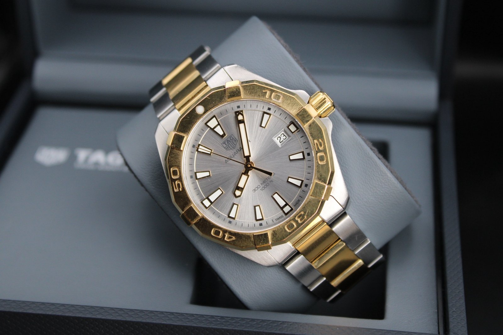 This is a stunning example hailing from the Aquaracer range from Tag Heuer. The watch features a silver dial with gold accents and a gold bezel and paired with a very elegant two tone steel and gold bracelet. The watch is in good overall condition showing some signs of wear to the gold as it could only have a light polish to avoid irritating the gold plating. There are some minor marks to the bezel also. If you are looking for a great dress watch that is sure to stand out and be noticed then look no further! We also have a ladies two tone Aquaracer in stock so why not treat yourself and partner to a new watch and make breaking the news a bit easier…. This 40mm men’s timepiece comes complete with its original box and papers, making it a perfect addition for both collectors and everyday enthusiasts.