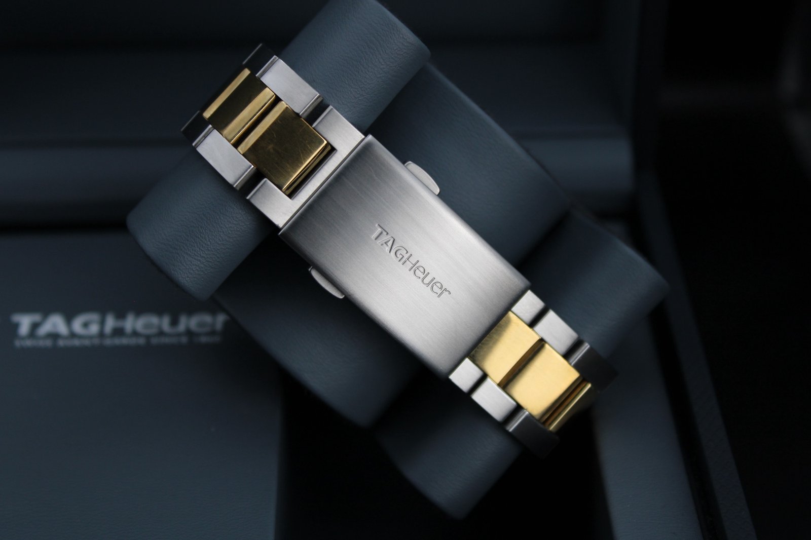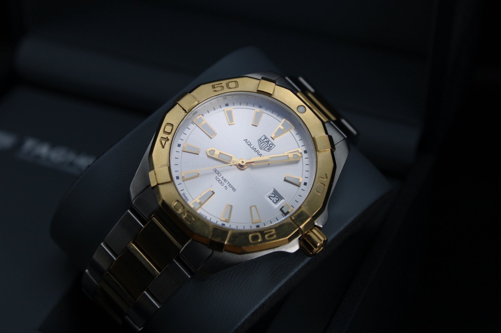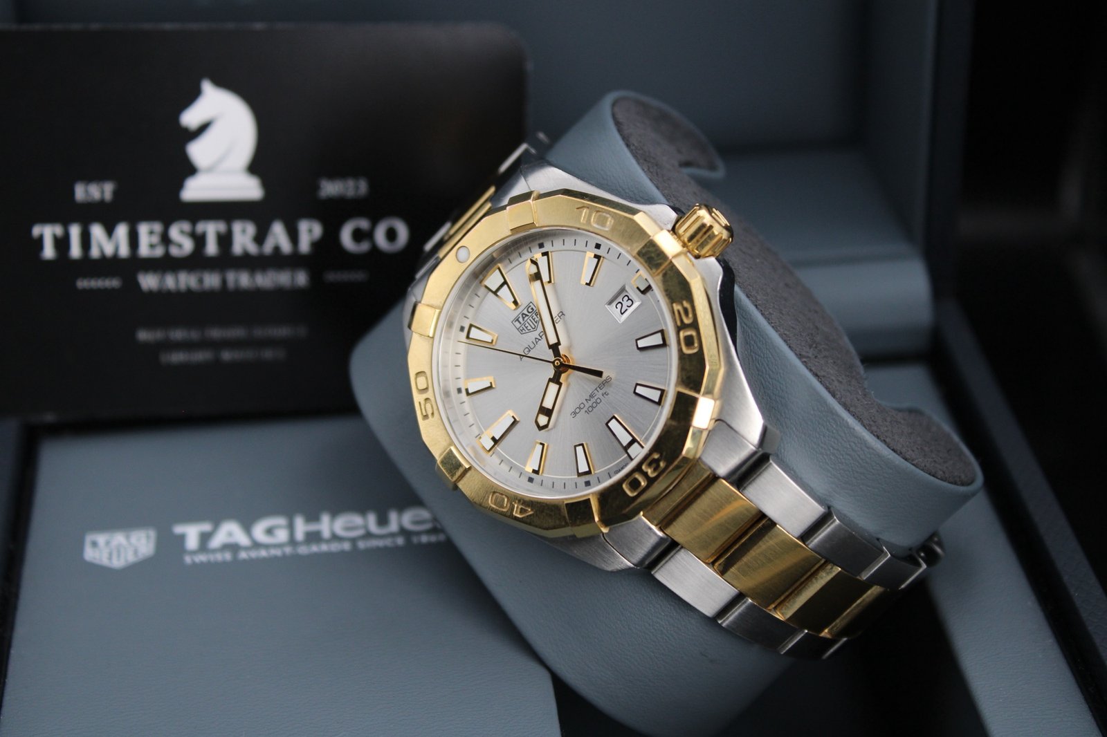 This is a stunning example hailing from the Aquaracer range from Tag Heuer. The watch features a silver dial with gold accents and a gold bezel and paired with a very elegant two tone steel and gold bracelet. The watch is in good overall condition showing some signs of wear to the gold as it could only have a light polish to avoid irritating the gold plating. There are some minor marks to the bezel also. If you are looking for a great dress watch that is sure to stand out and be noticed then look no further! We also have a ladies two tone Aquaracer in stock so why not treat yourself and partner to a new watch and make breaking the news a bit easier…. This 40mm men’s timepiece comes complete with its original box and papers, making it a perfect addition for both collectors and everyday enthusiasts.
