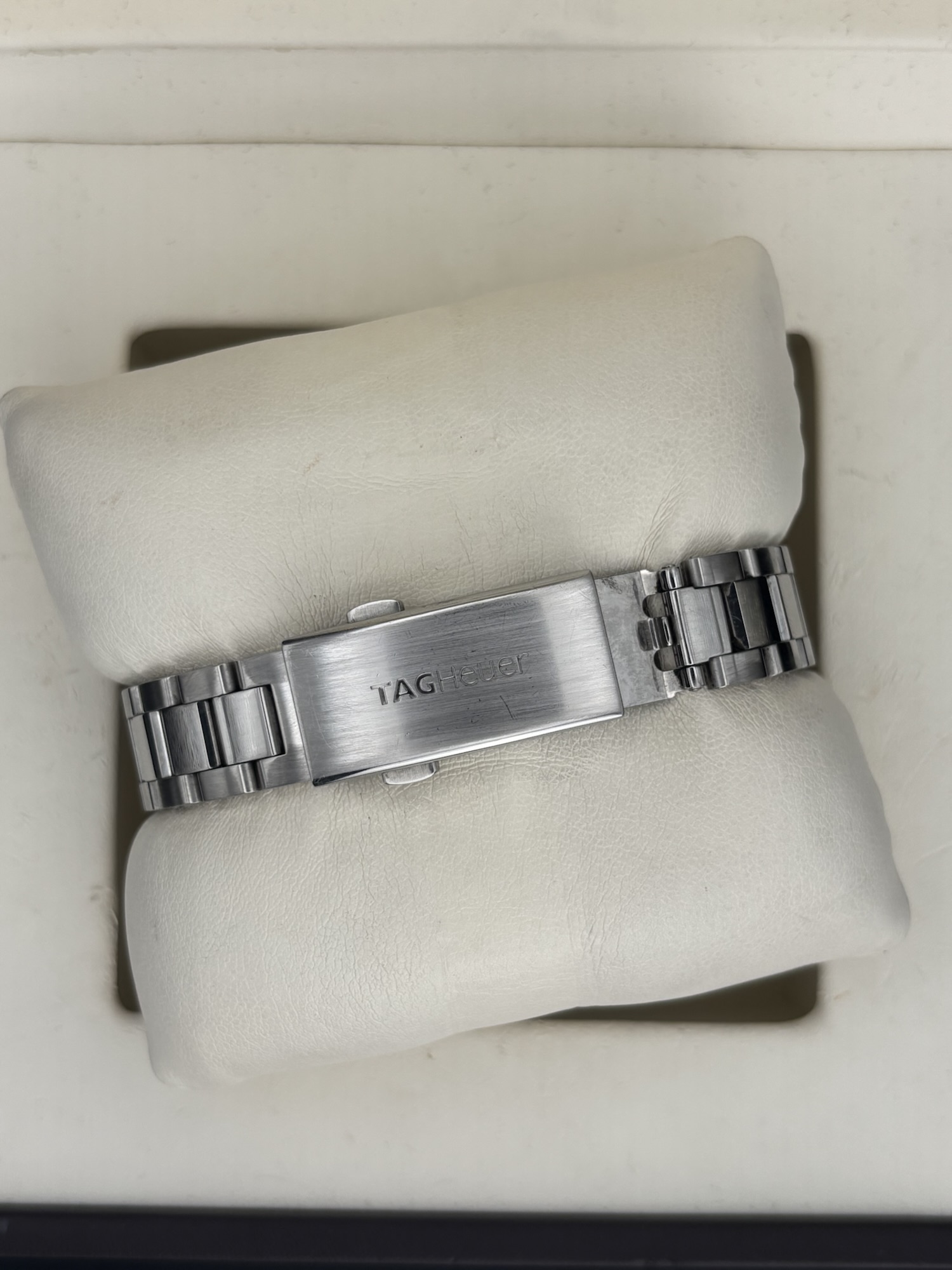 This is a beautiful example from the ladies Aquaracer range from Tag Heuer. The watch has a very deep blue dial which can be mistaken for black when lighting is low, it works great with the silver bezel the allows the blue to really shine through when it’s exposed to light. This particular watch is one that has been worn and enjoyed, there are some marks to the bezel, bracelet and clasp but we have given it a light polish for its new owner. This would make a great Christmas gift for your loved one or even a special treat to yourself! This 27mm women’s timepiece comes complete with its original box and papers, making it a perfect addition for both collectors and everyday enthusiasts.