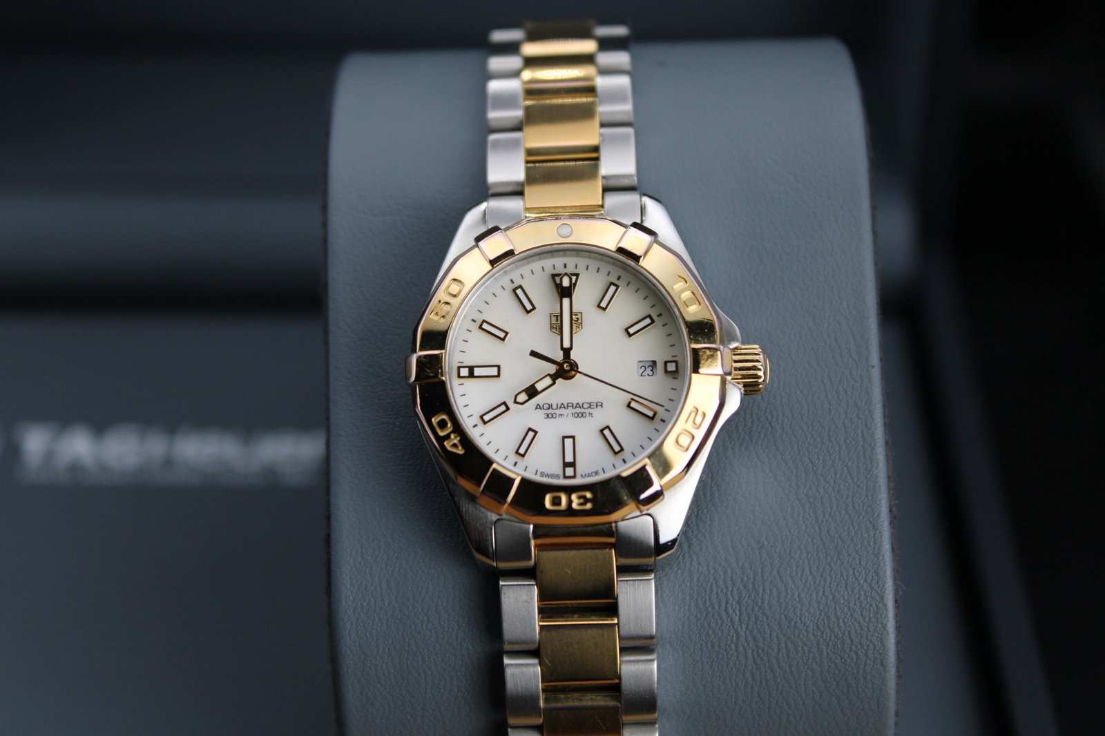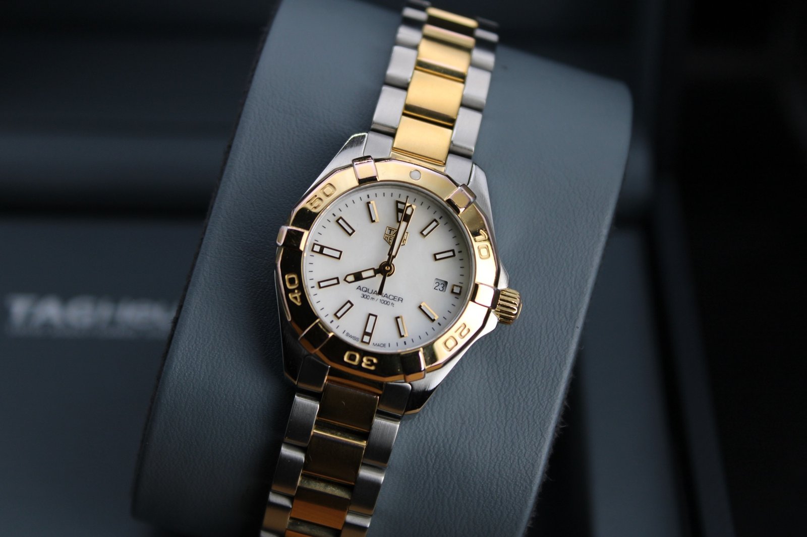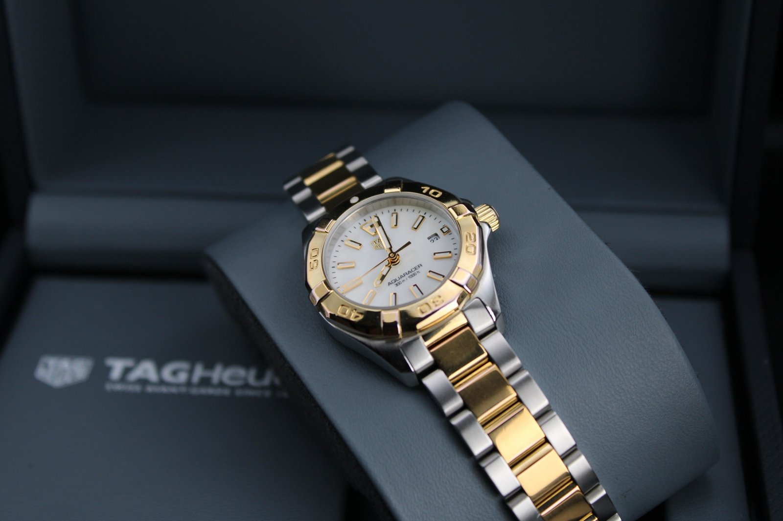 This is a beuatiful example from the ladies Aquaracer range by Tag Heuer. It features a stunning Mother of Pearl dial with gold accents and a gold bezel on a two tone silver and gold bracelet which has recent been polished so looks great (there are still some minor signs of wear to the gold as it only received a light polish to avoid disturbing the gold plating). This is the perfect watch for those special occasions where you want a bold watch that is sure to stand out and be noticed!. This 27mm women’s timepiece comes complete with its original box and papers, making it a perfect addition for both collectors and everyday enthusiasts.
