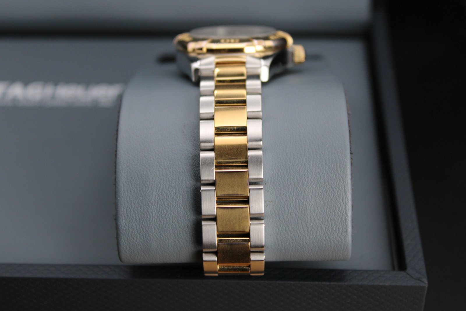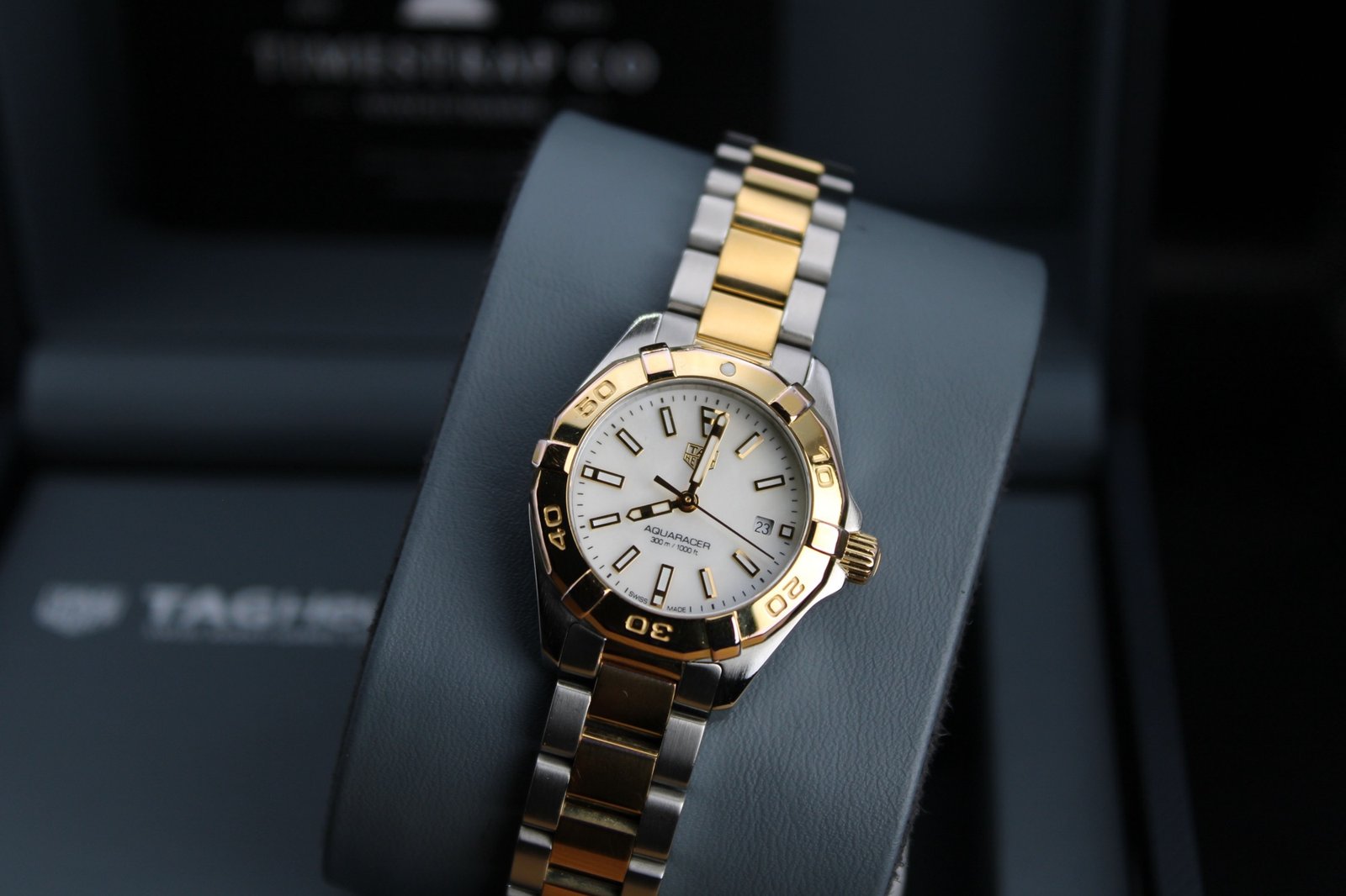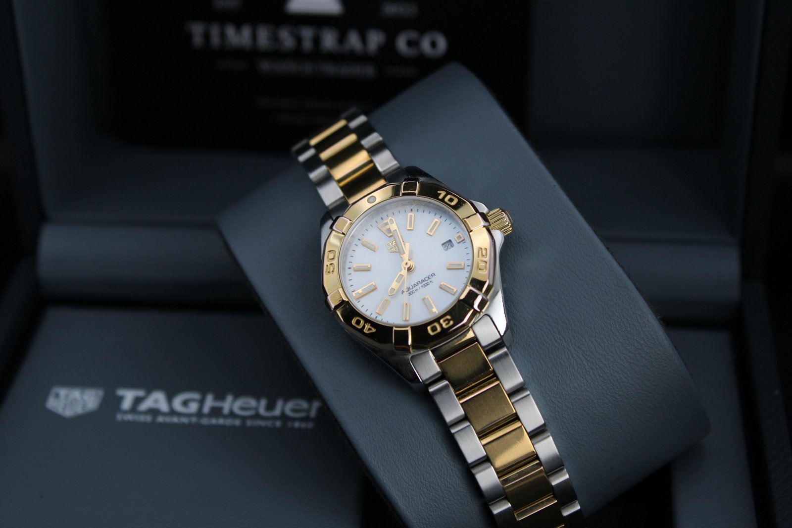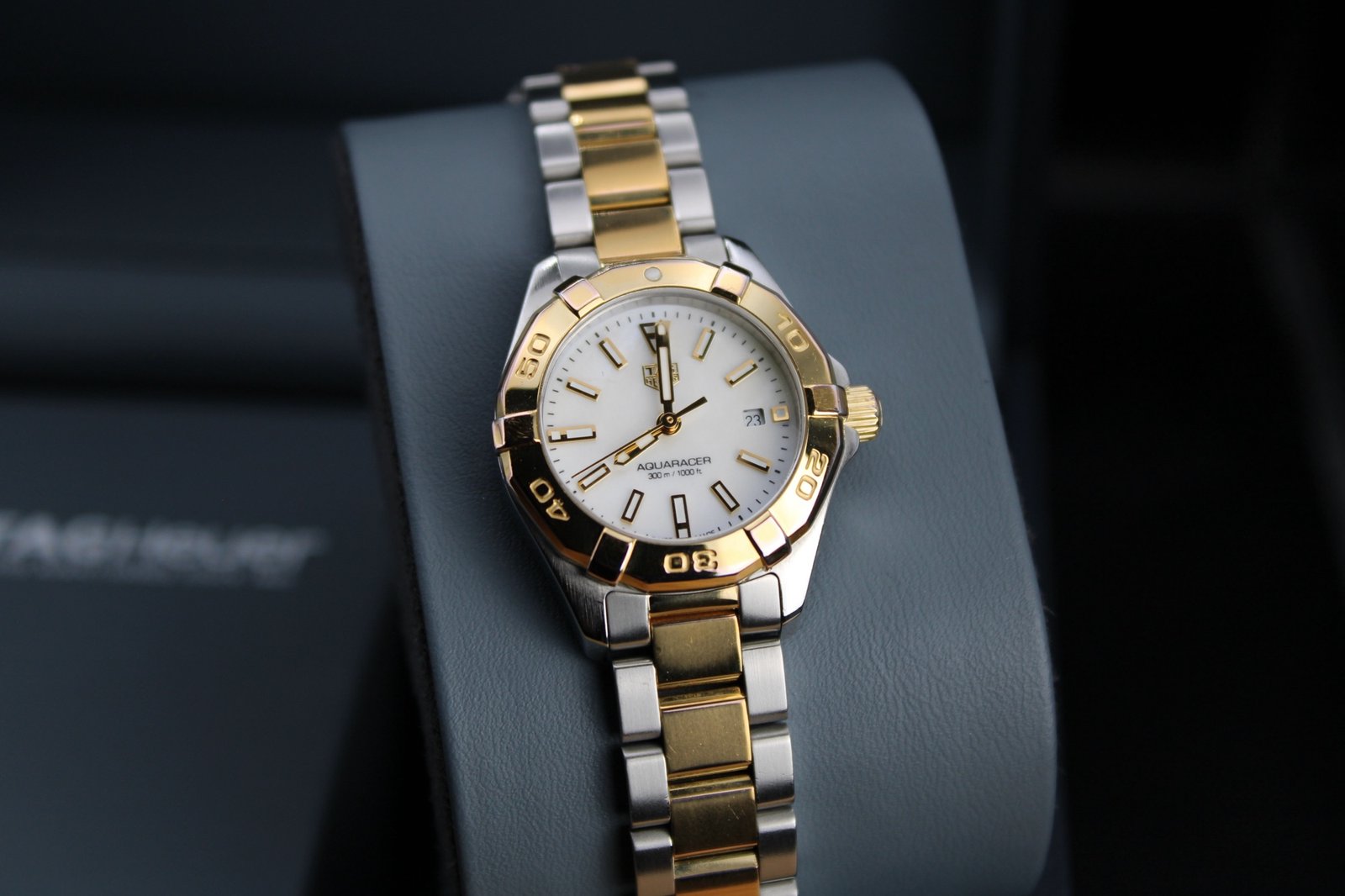This is a beuatiful example from the ladies Aquaracer range by Tag Heuer. It features a stunning Mother of Pearl dial with gold accents and a gold bezel on a two tone silver and gold bracelet which has recent been polished so looks great (there are still some minor signs of wear to the gold as it only received a light polish to avoid disturbing the gold plating). This is the perfect watch for those special occasions where you want a bold watch that is sure to stand out and be noticed!. This 27mm women’s timepiece comes complete with its original box and papers, making it a perfect addition for both collectors and everyday enthusiasts.