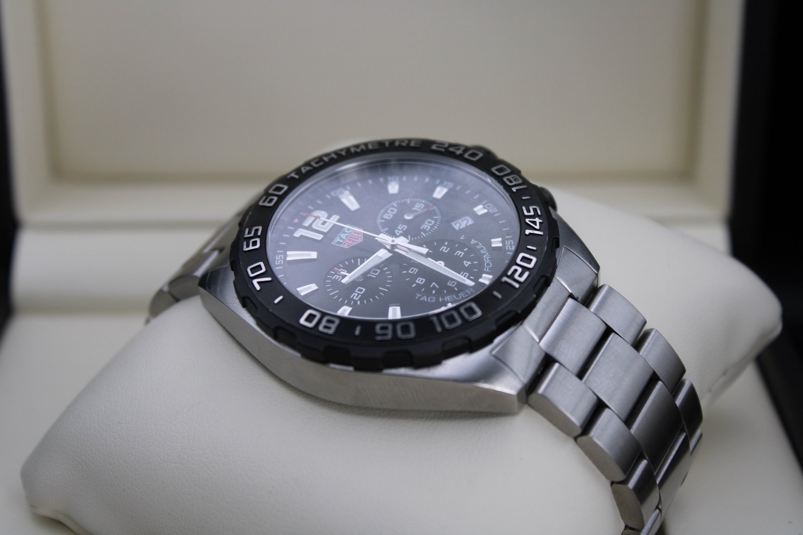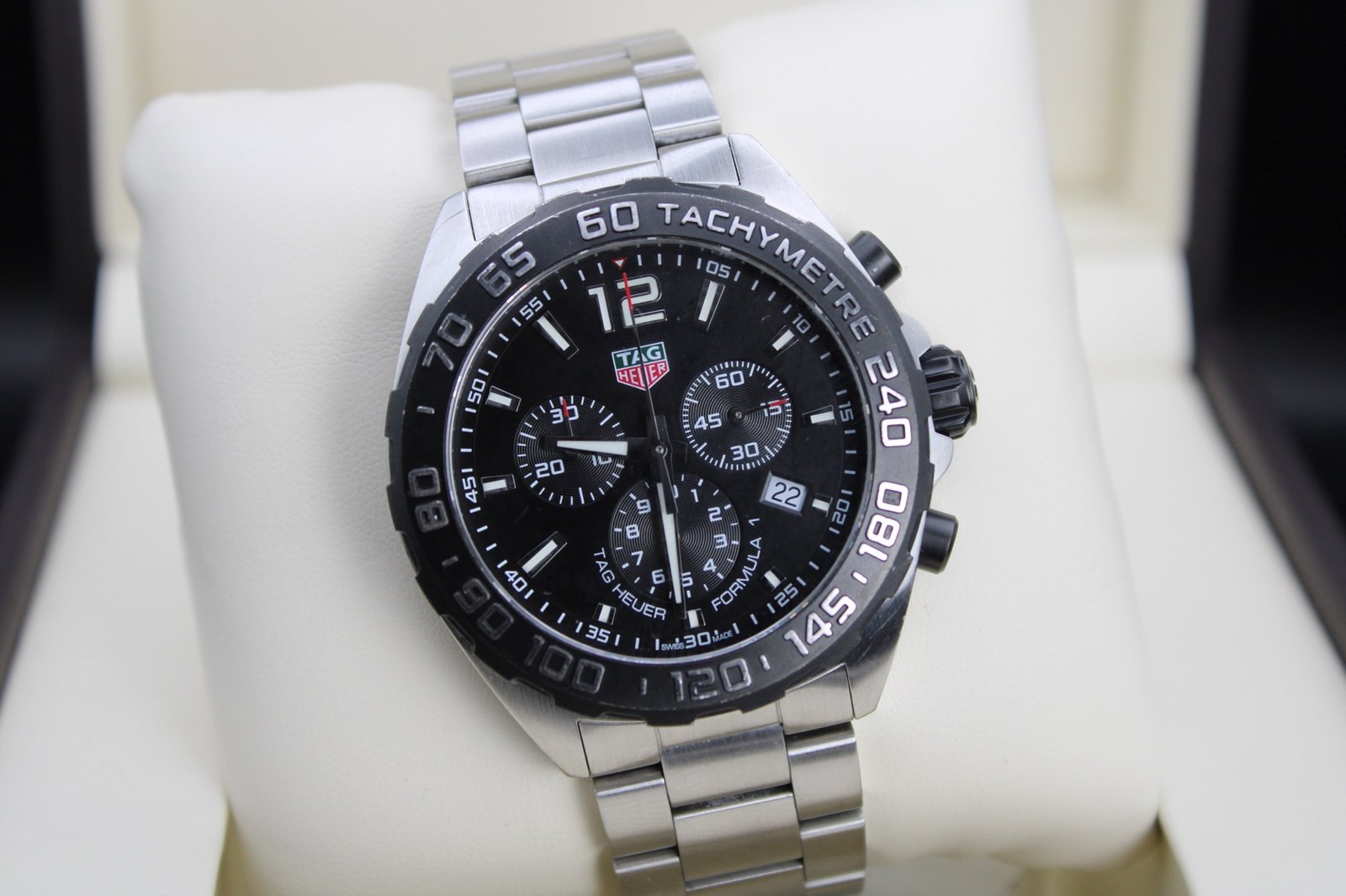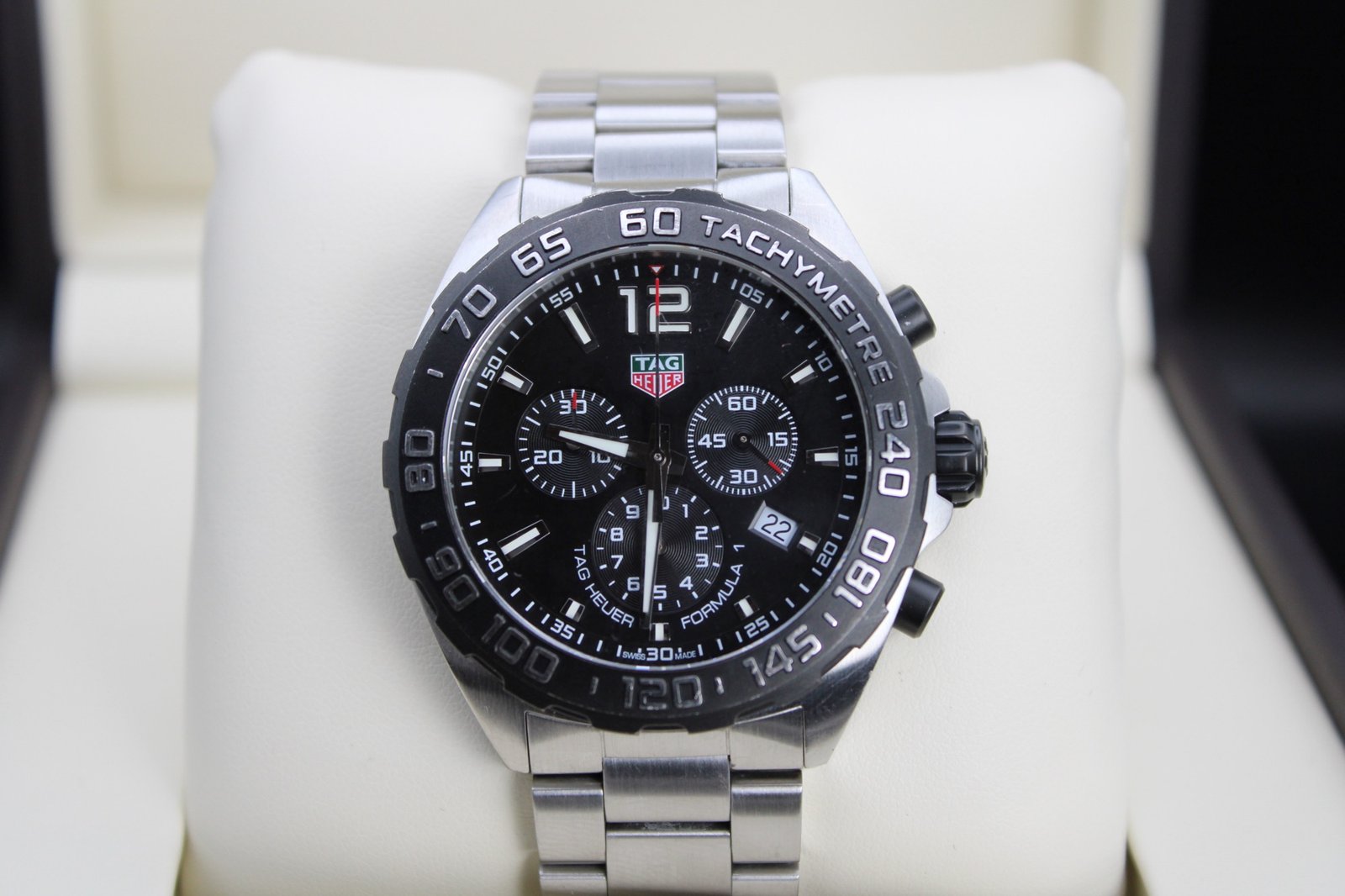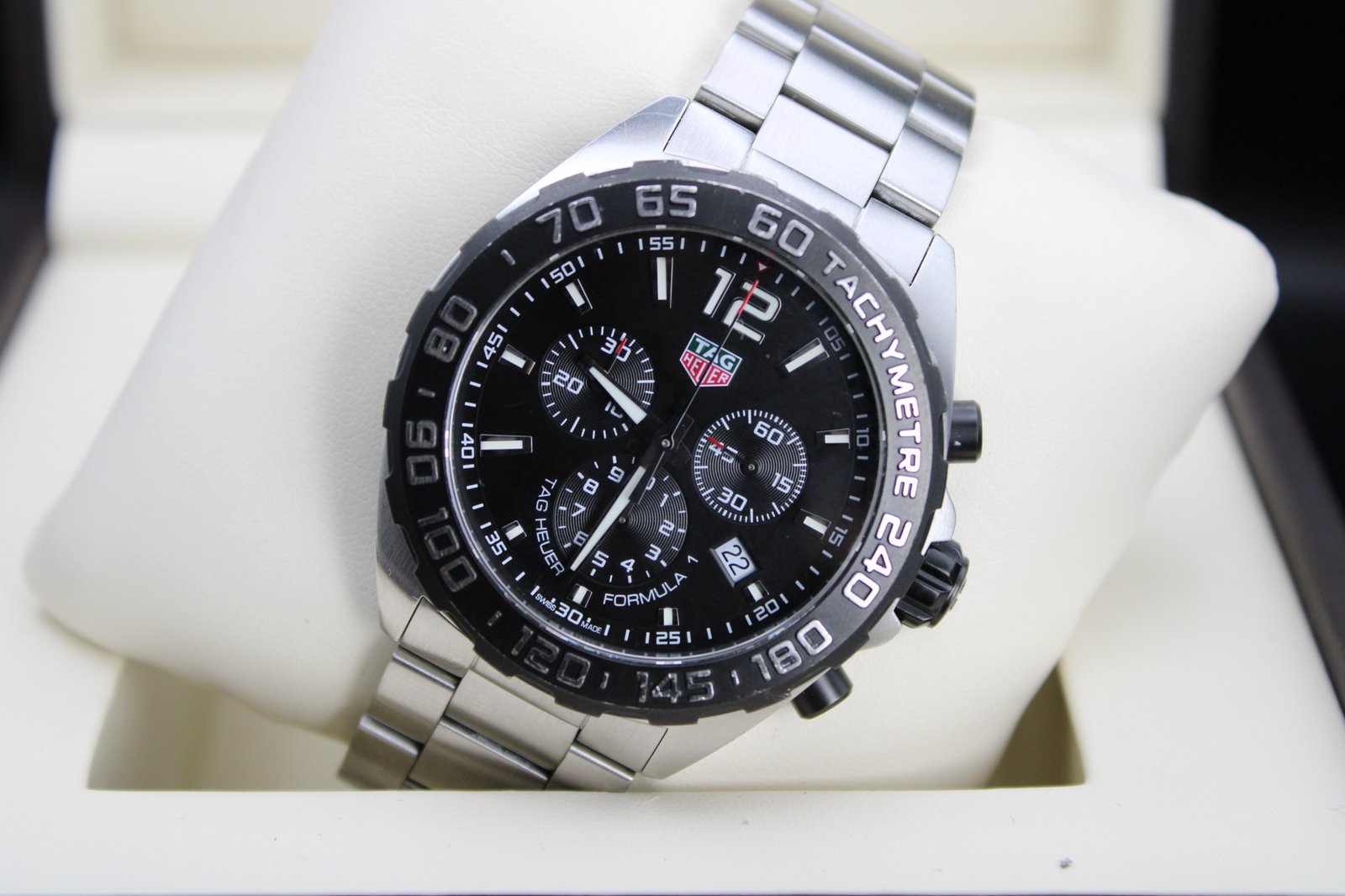 This is a beautiful example from the Formula 1 Chronograph range, this watch is suitable for all occasions and can be worn daily or used as a special occasions piece. It features a stunning black dial and bezel and is placed on a steel bracelet. It is a Chronograph which means it has many additional features over a standard watch such as a second, minute and hour counting feature as well as a stop watch feature .This 43mm men’s timepiece comes complete with its original box and papers, making it a perfect addition for both collectors and everyday enthusiasts.