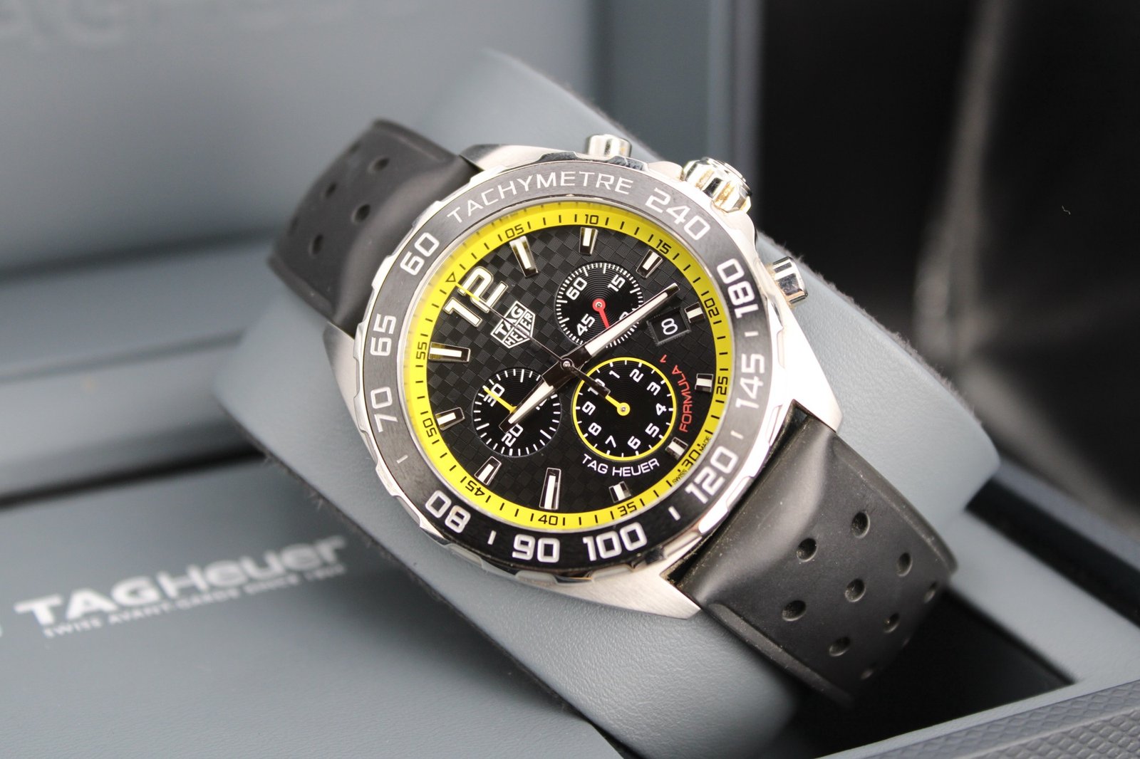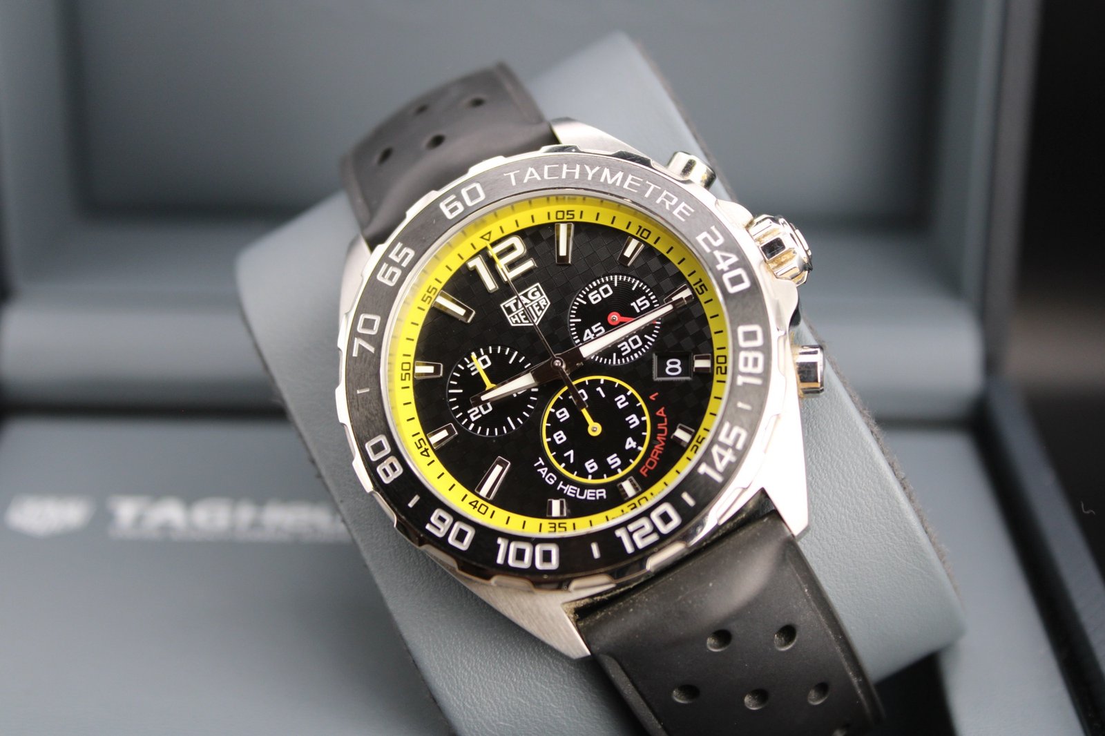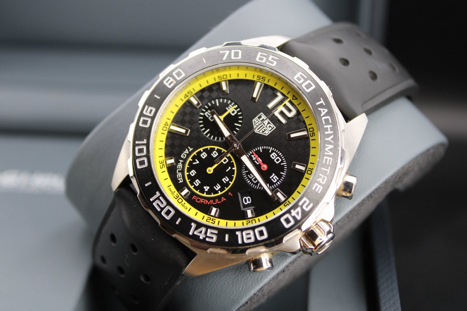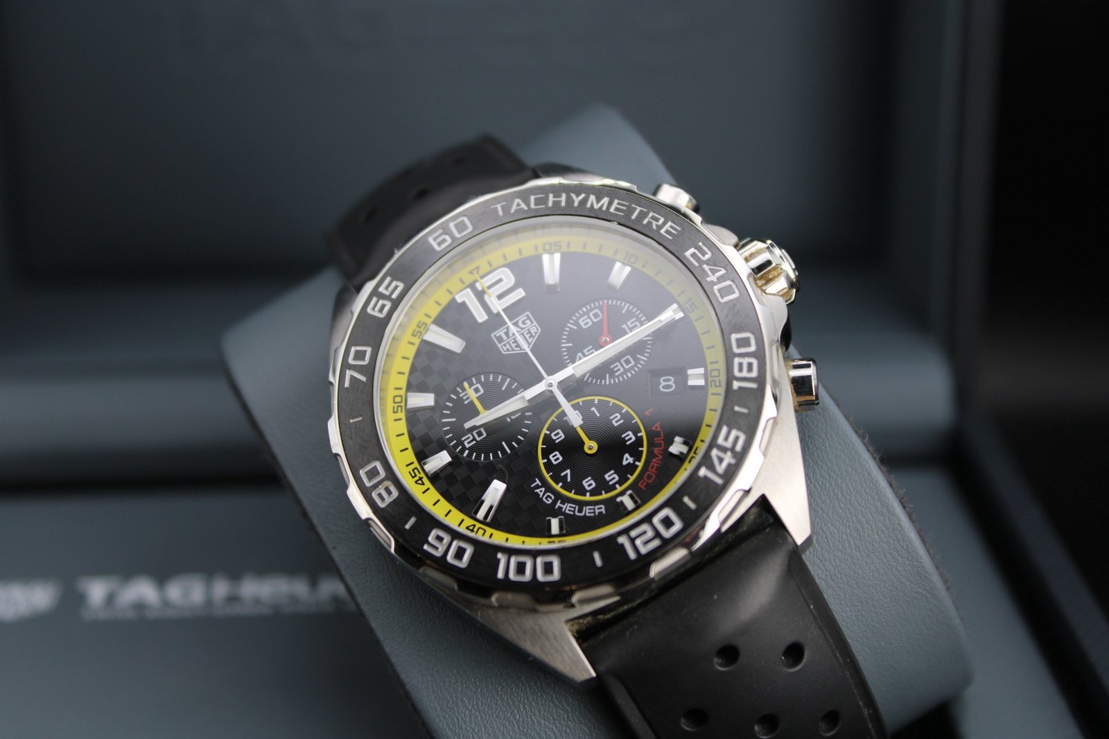 This is a great everyday day watch hailing from the Formula 1 range by Tag Heuer, this watch features a sleek carbon fibre effect on the dial with an eye-catching yellow circle around the outside of the dial. It also has a black ceramic bezel on a black rubber strap. This is a great watch for everyday wear due to the robust ceramic bezel and rubber bracelet. This watch can be worn for many activities such as the gym or any other sporting effects while also being more than capable of being dressed up! If you want a sleek watch which is suitable for everyday wear but has a slight hint of boldness to it, then this is the watch for you! This 43mm men’s timepiece comes complete with its original box and papers, making it a perfect addition for both collectors and everyday enthusiasts.