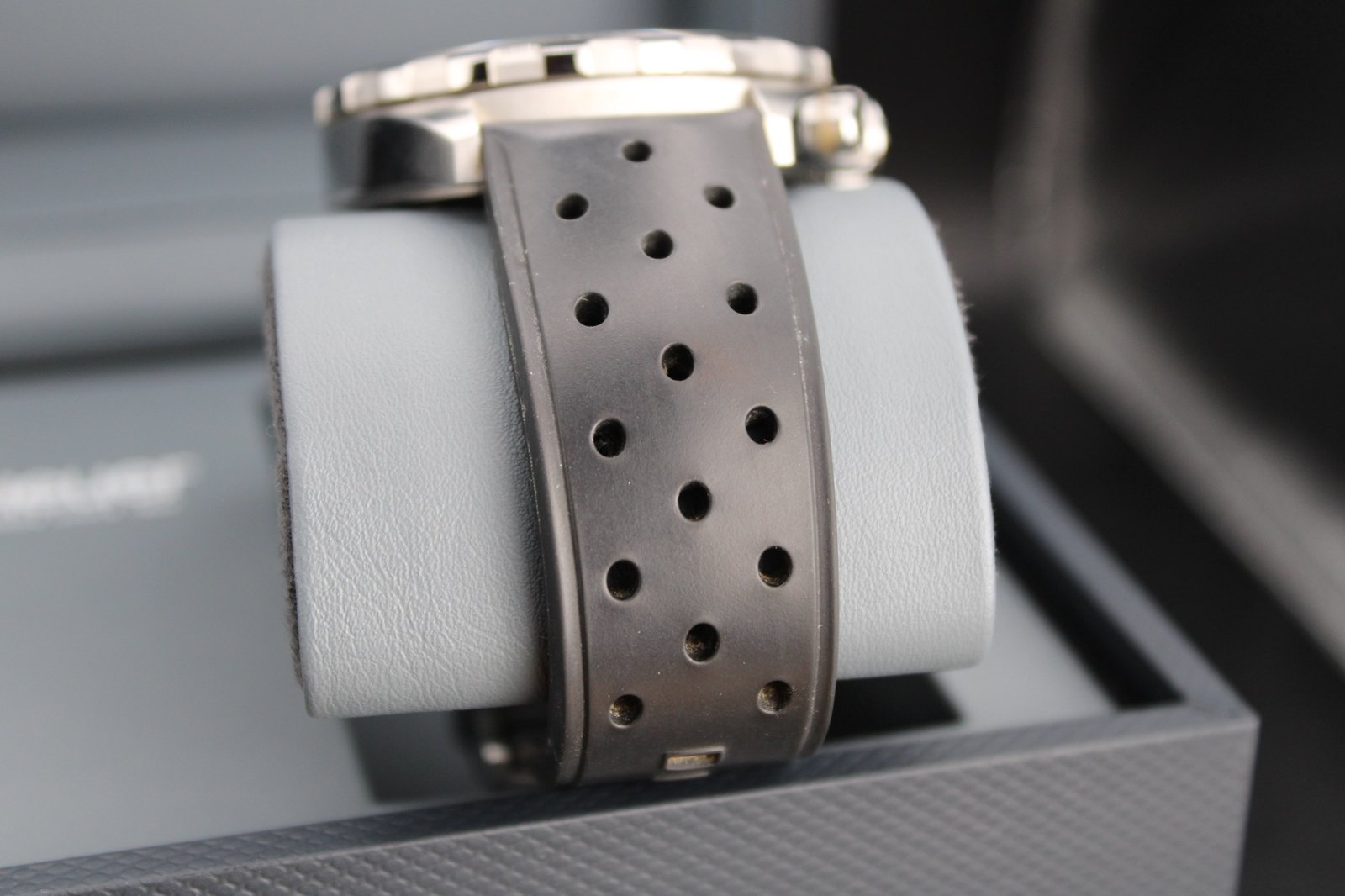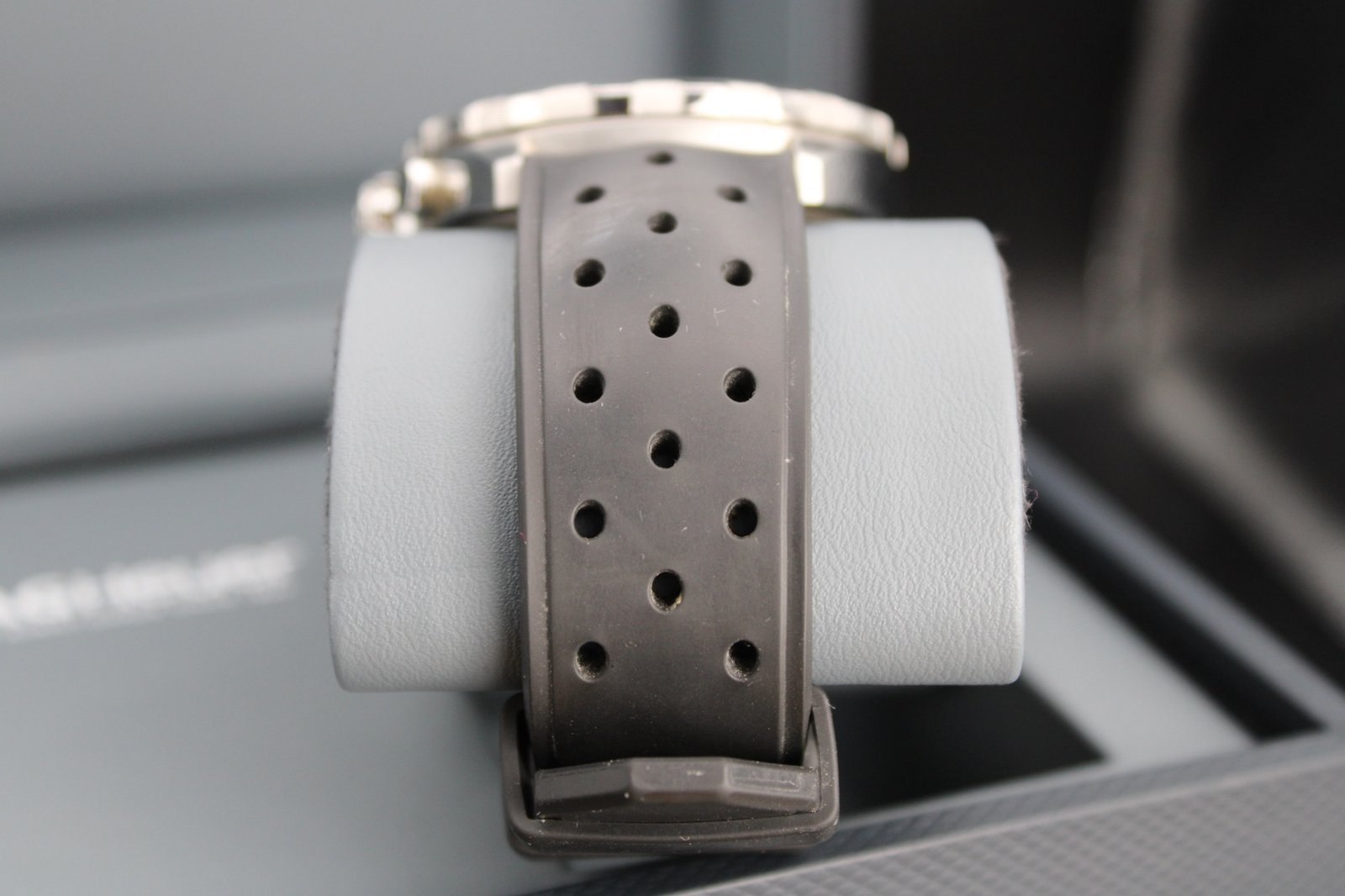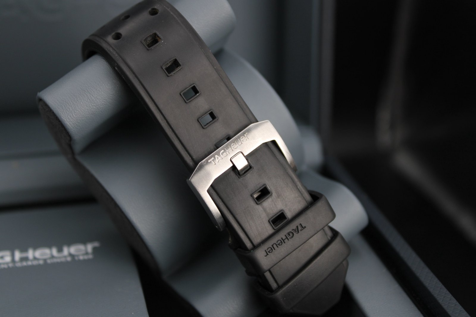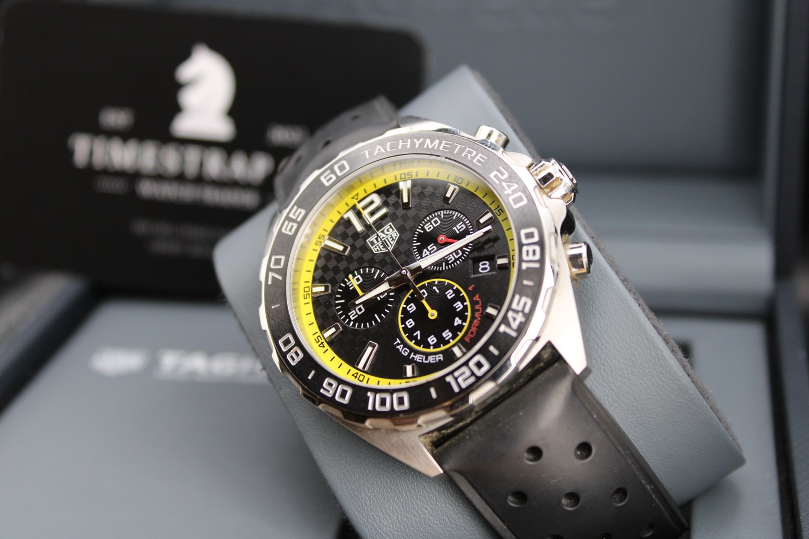 This is a great everyday day watch hailing from the Formula 1 range by Tag Heuer, this watch features a sleek carbon fibre effect on the dial with an eye-catching yellow circle around the outside of the dial. It also has a black ceramic bezel on a black rubber strap. This is a great watch for everyday wear due to the robust ceramic bezel and rubber bracelet. This watch can be worn for many activities such as the gym or any other sporting effects while also being more than capable of being dressed up! If you want a sleek watch which is suitable for everyday wear but has a slight hint of boldness to it, then this is the watch for you! This 43mm men’s timepiece comes complete with its original box and papers, making it a perfect addition for both collectors and everyday enthusiasts.
