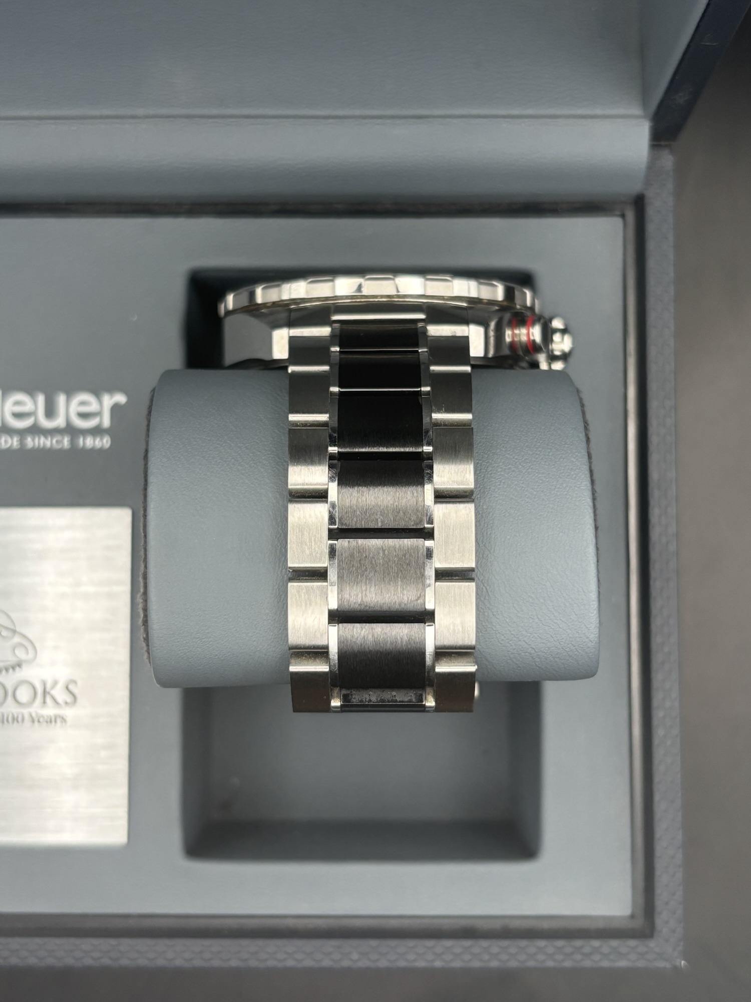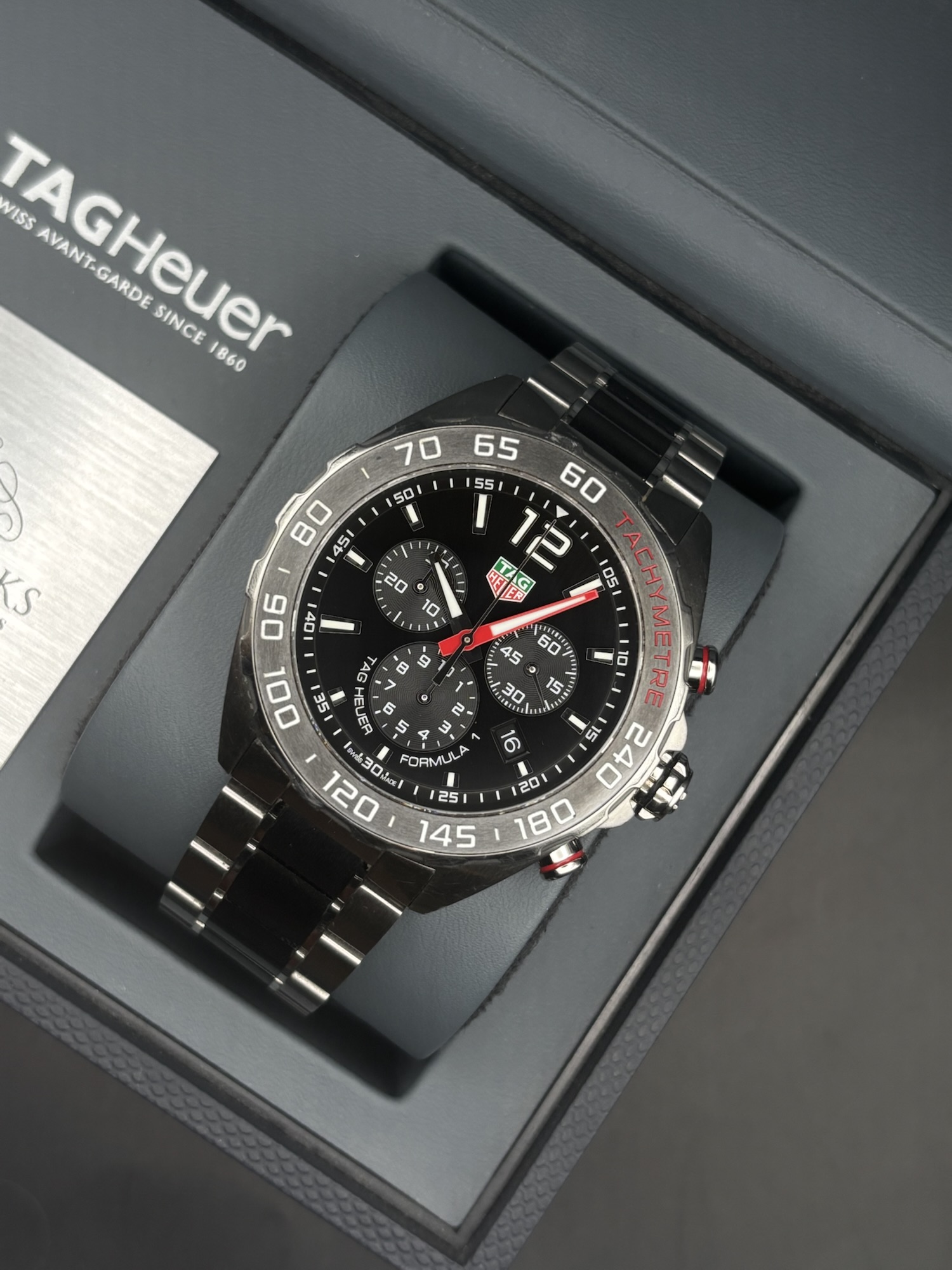 This is a stunning example from the Formula 1 Chronograph range from Tag Heuer. The CAZ101Z is a limited-edition Tag Heuer which is limited to 1919 pieces to mark the 100 year milestone for Beaverbrooks. The particular watch we currently have in stock is number 495 out of the 1919 reportedly released. The watch benefits from a recent light polish which is reflected in the condition, there are some minor scratches to the bracelet. The watch comes on the sleek BA0843 ceramic bracelet which adds to it’s look and really helps the red accents throughout the dial and bezel pop. This 43mm men’s timepiece comes complete with its original box and papers, making it a perfect addition for both collectors and everyday enthusiasts.