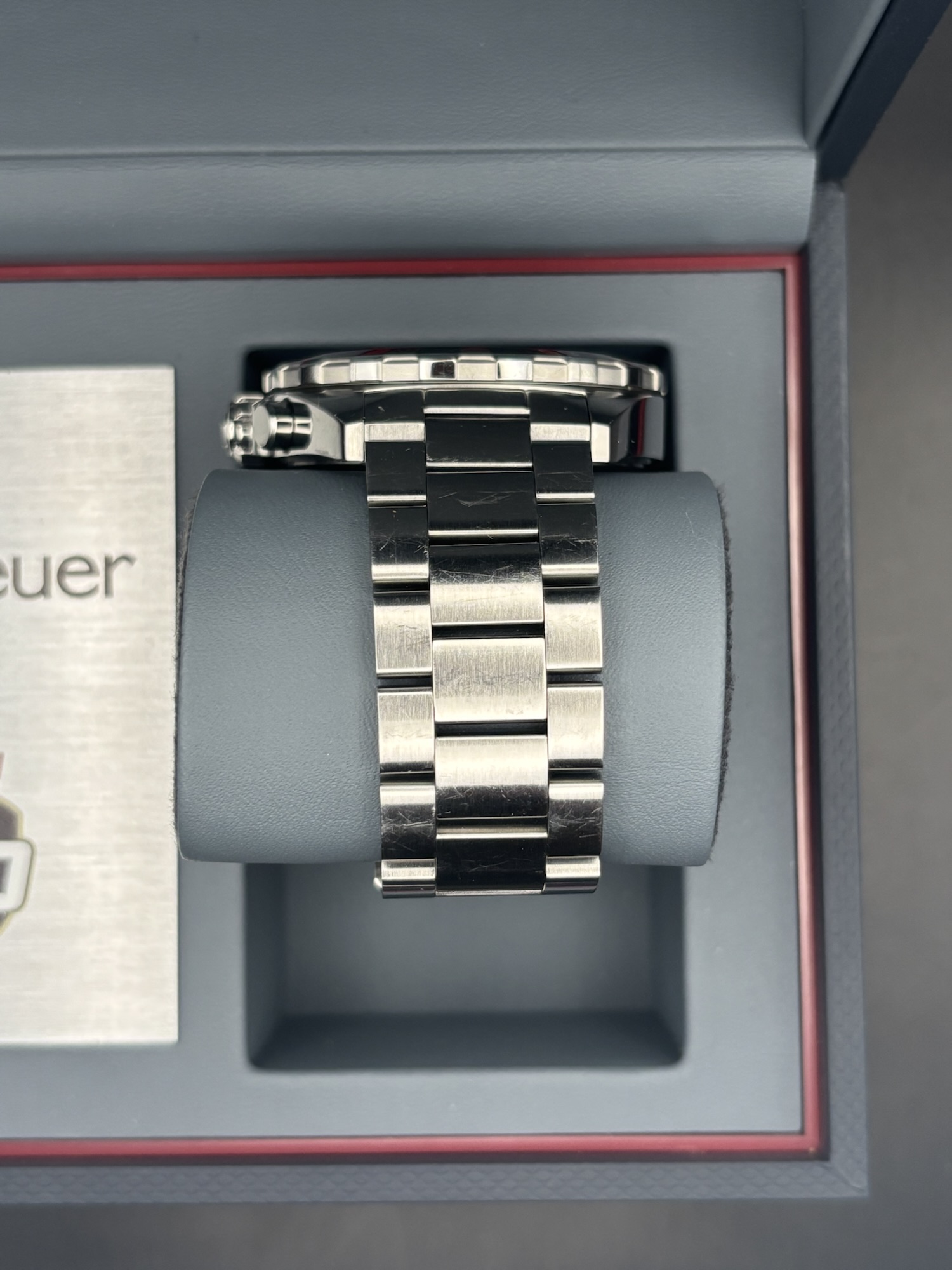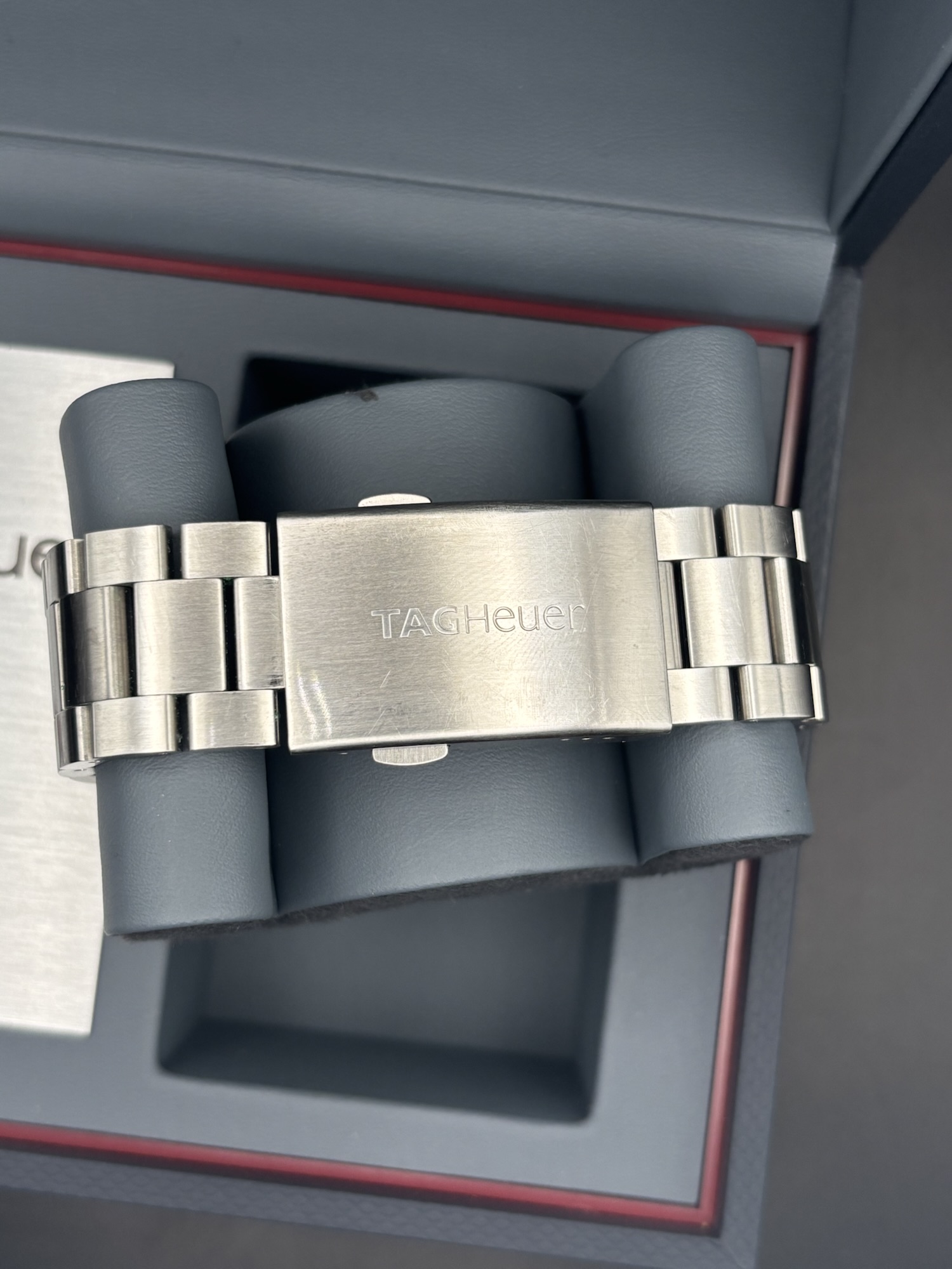 This is a limited edition run from Tag Heuer which celebrates the longstanding partnership between Tag Heuer and the Indianapolis 500 race, this limited edition is limited to 500 pieces worldwide. This watch is a fine example from the Formula 1 range with its sleek black dial and bezel with white and red accents throughout, it is placed on a silver case and bracelet which works really well and brings the whole watch together. This 43mm men’s timepiece comes complete with its original box and papers, making it a perfect addition for both collectors and everyday enthusiasts.